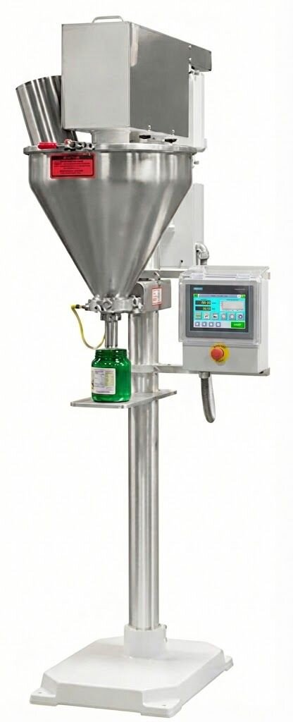 Auger Fillers typically use a cone shaped hopper and dispense products using an auger screw – a screw-shaped device that transports materials forward by rotating. Auger Fillers are best suited for filling dry free flowing and non-free flowing products, powders, and granules. (ie: table salt, sugars and spices, flour, etc)